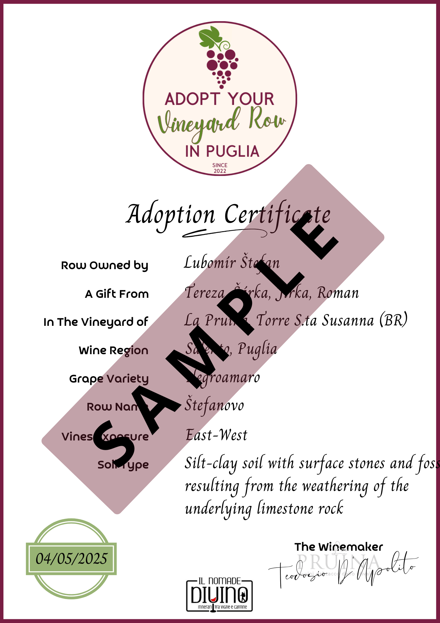 2. We will send to the adopers the digital Adoption Certificate, with the references of the row, the vineyard and the soil characteristics of the vineyard